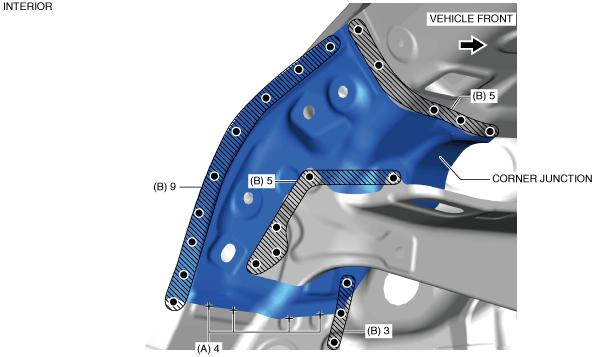2.Drill the spot welds in the 22 locations in area B shown in the figure from the interior.
