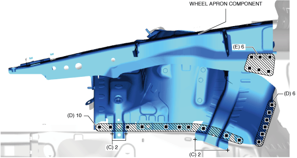 7.Plug welds in the 16 locations in area D shown in the figure from the front wheel housing.