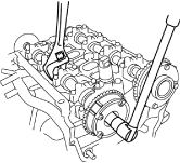 • If the camshaft is rotated with the timing chain removed and the piston at the top dead center position, the valve may contact the piston and the engine could be damaged. When rotating the camshaft with the timing chain removed, rotate it after lowering the piston from the top dead center position.• When rotating the camshaft using a wrench on the cast hexagon, the wrench may contact the rocker arm and damage the rocker arm. To prevent damage to the rocker arm when holding the camshaft on the cast hexagon, use the wrench at engine rear side as shown in the figure to secure a clearance between the cam.