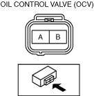 2.Apply battery positive voltage between the OCV terminals and verify that the spool valve operates and moves to the maximum valve timing retard position.