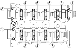 2.Loosen the camshaft cap installation bolts in two or three passes in the order shown in the figure and remove the camshaft caps.