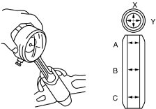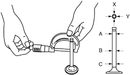 3.Measure the valve stem diameter of each valve using the micrometer. Measurement positions total six and are in the X and Y directions, at three points (A, B, and C) as shown in the figure.