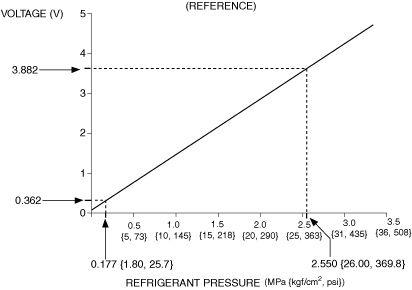 3.The refrigerant pressure sensor detects the electrical load (capacitance) which changes according to the clearance amount, and converts it to a voltage value at the signal processing area. The voltage value characteristic increases if the refrigerant pressure increases, and decreases if the refrigerant pressure decreases.
