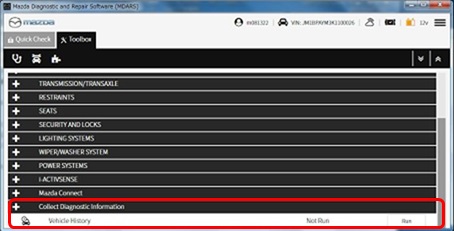 - Select “Vehicle History” under “Collect Diagnostic Information”, then click “Run”.