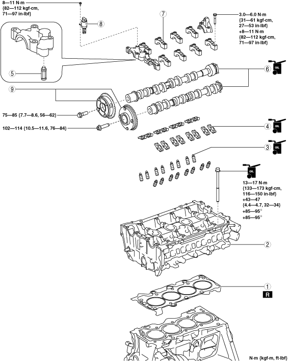 Electric variable valve timing actuator (intake side): 102—114 N·m {10.5—11.6 kgf·m, 76—84 ft·lbf}Hydraulic variable valve timing actuator (exhaust side): 75—85 N·m {7.7—8.6 kgf·m, 56—62 ft·lbf}