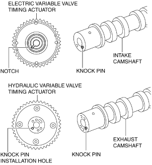 1.Align the knock pin on the end of the camshaft with the notch on the actuator (intake side) or knock pin installation hole (exhaust side), then install the actuator to the camshaft.