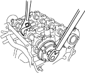 • If the camshaft is rotated with the timing chain removed and the piston at the top dead center position, the valve may contact the piston and the engine could be damaged. When rotating the camshaft with the timing chain removed, rotate it after lowering the piston from the top dead center position.• When rotating the camshaft using a wrench on the cast hexagon, the wrench may contact the rocker arm and damage the rocker arm. To prevent damage to the rocker arm when holding the camshaft on the cast hexagon, use the wrench at engine rear side as shown in the figure to secure a clearance between the cam.