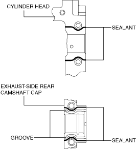 • To prevent engine oil leakage, apply sealant to the rear camshaft cap installation area on the exhaust side or the rear camshaft caps on the exhaust side of the cylinder head, and seal the journal.