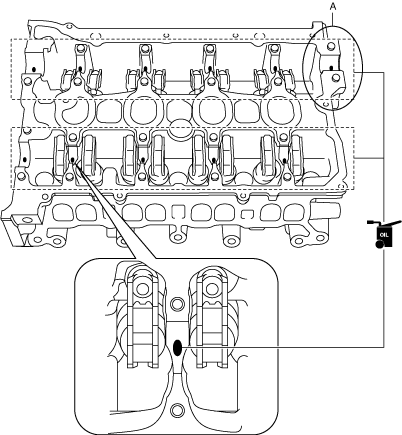 1.As shown in the figure, apply gear oil (SAE No. 90 or equivalent) or engine oil to the center area of each journal of the cylinder head.