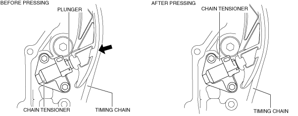 3.Press the timing chain in the direction of the arrow and press in the chain tensioner plunger to the position where the groove and body hole are aligned.