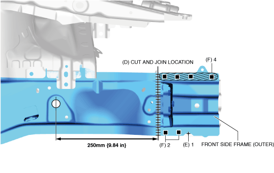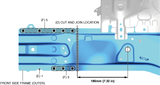 6.Plug welds in the 6 locations in area F shown in the figure and install the front side frame (outer).