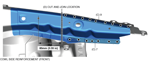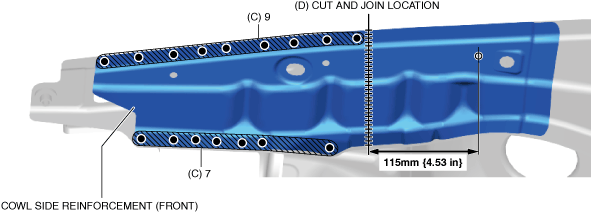 7.Cut and join the part to area D shown in the figure and install the cowl side reinforcement (front).