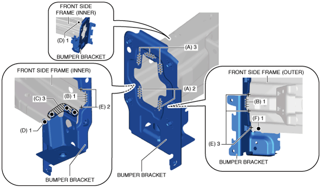 • If the front side frame flange is damaged when grinding the continuous arc welds in the 5 locations in area A shown in the figure, the integrity of the bumper bracket installation could be compromised. For the 5 locations in area A, look at the grinding locations while performing the work so the front side frame does not get damaged.