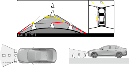 • The top view assists the driver in checking the area around the vehicle while the vehicle is moving forward or reversing, and combines video signals from the four cameras (front camera, side cameras (LH, RH), rear mount camera) equipped to the vehicle and displays the viewpoint of the area around the vehicle from the top of the vehicle on the center display.• The top view displays on the right side of the screen when the screen of the front view, front wide view, rear view or rear wide view is being displayed.