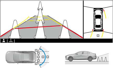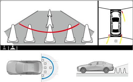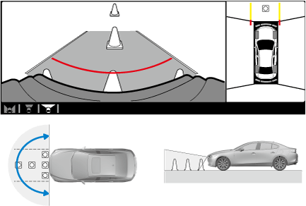 ― If an image containing an object with a color is picked up in the wide range by any of the cameras, it may display in that color.― Color may appear differently that in actuality at the seams where each of the camera images merge.― Obstructions displayed in the front view may not display on the top view screen.― If the position or angle of each camera changes due to tilting of the vehicle, the image may appear distorted.― Lines on the road may appear distorted at the seams where each of the camera images merge.― People or obstructions displayed on the screen may appear differently than in actuality. (People or obstructions may appear fallen, larger, or longer than they actually are.)