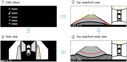 • When the 360° view monitor switch is pressed while the top view/front view, top view/rear view, top view/front wide view, top view/rear wide view, or side view is displayed, the 360° view monitor control module switches the displayed image.