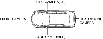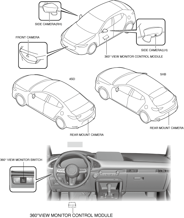 ― 360°view monitor control module(See 360°VIEW MONITOR CONTROL MODULE.)― front camera(See 360°VIEW MONITOR SYSTEM CAMERA.)― side camera(RH)(See 360°VIEW MONITOR SYSTEM CAMERA.)― side camera(LH)(See 360°VIEW MONITOR SYSTEM CAMERA.)― rear mount camera(See 360°VIEW MONITOR SYSTEM CAMERA.)― 360°view monitor switch(See 360°VIEW MONITOR SWITCH.)