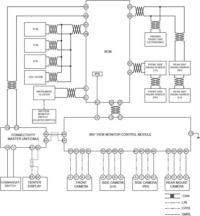 4.The center display indicates (5) the images at the area around the vehicle based on the LVDS signal received from the CMU.