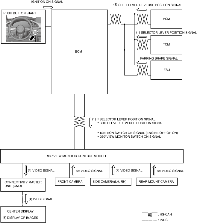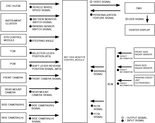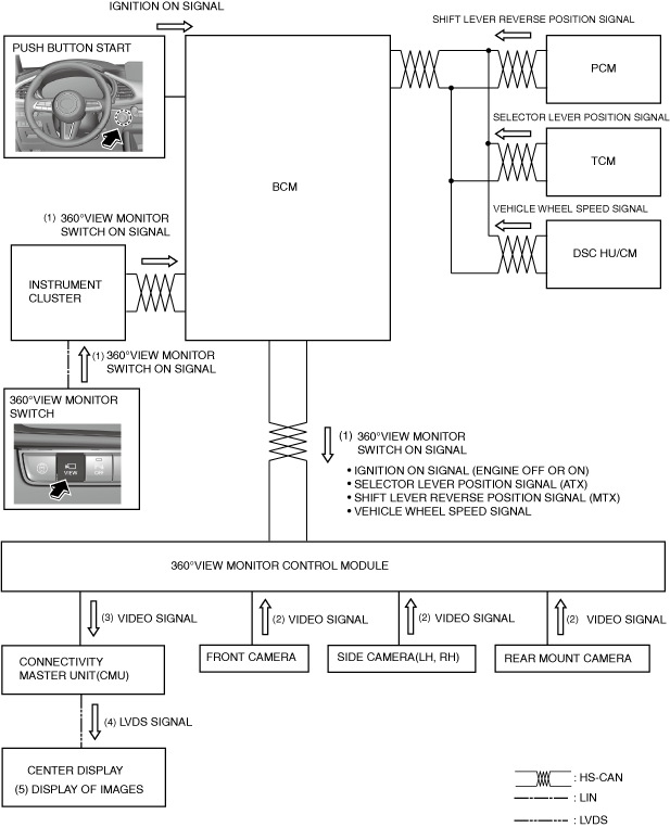 1.When a selector lever R position signal(ATX) or shift lever reverse position signal(MTX) is received (1) with the operation conditions met, the 360° view monitor control module receives an image signal (2) from the front camera/side cameras (LH, RH)/rear mount camera.