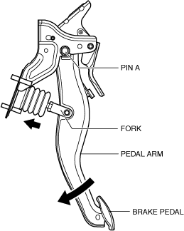 • When the brake pedal is depressed, the pedal arm rotates at the pin A fulcrum point, and the pedal depression force is transmitted to the fork of the power brake unit.• This pedal depression force pushes in the fork to operate the brakes.