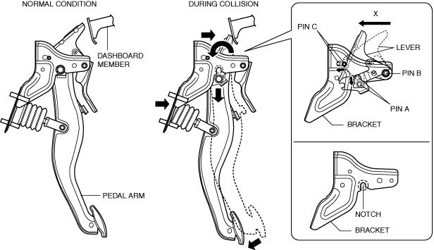 • In a frontal collision, the brake pedal is forced rearward by the movement of the dashboard.• In response to this, force in the direction of X is applied to the brake pedal lever because the dashboard member and brake pedal lever interfere.• With the addition of force in the direction of X, pin C releases from the lever, and the lever rotates around the pin B fulcrum point.• When the lever rotates, it obstructs pin A at the fulcrum point of the pedal arm.• If the pedal rotates further, pin A separates from the bracket (notch), and the pedal is freed.• By freeing the pedal arm, the force applied to the lower extremities is reduced.