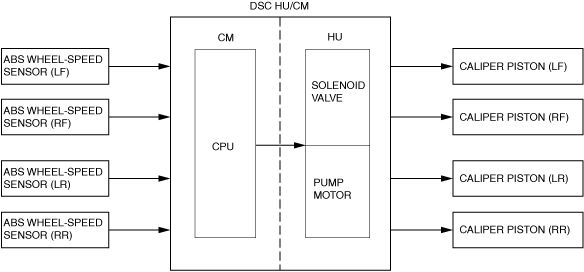 • EBD control detects the slip ratio between the estimated vehicle speed and rear wheels from the ABS wheel-speed sensor signals. If the slip ratio of the rear wheels as compared to the front wheels is larger than the fixed limit, the DSC HU/CM reduces brake pressure being distributed to the rear wheels. Due to this, brake pressure distribution is constantly controlled in the proper proportion and in relation to vehicle load, road surface conditions, and vehicle speed.