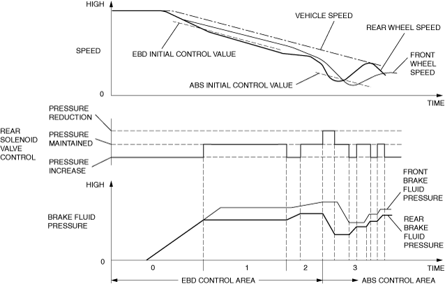 • If ABS control conditions are met during EBD control, EBD control is stopped and ABS control is given priority.