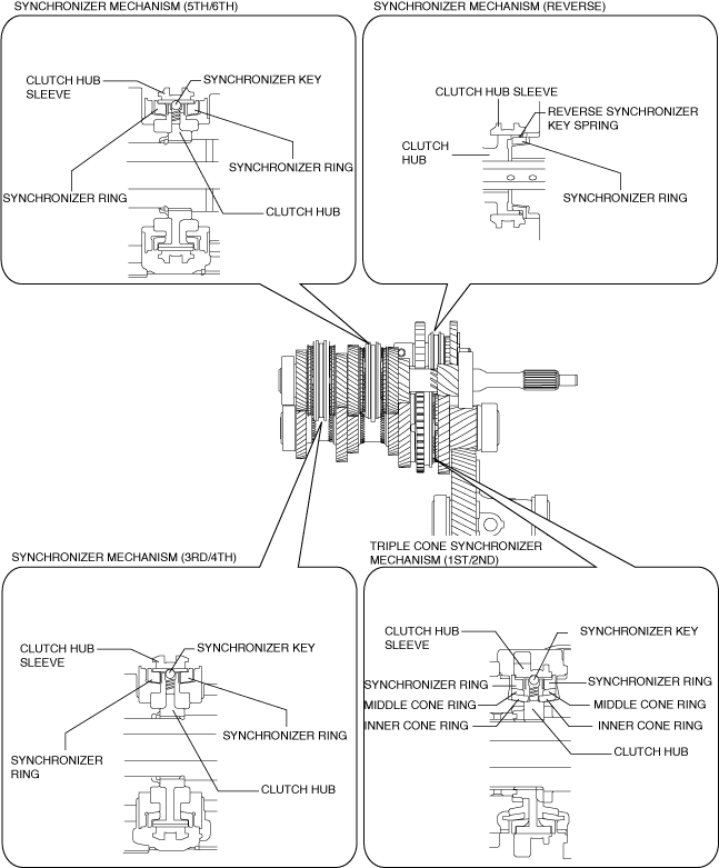 • For 1st and 2nd gears, a triple-cone synchronizer mechanism has been adopted with which a stronger synchronizing force is provided to synchronize the rotation of the clutch hub and the gear.• Here, operation during 2GR operation is described as an example.