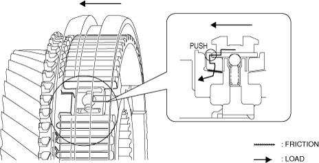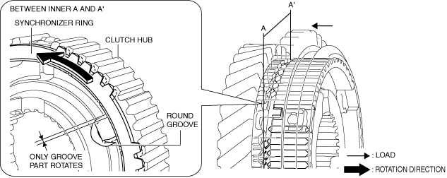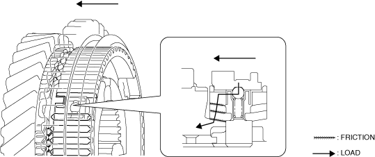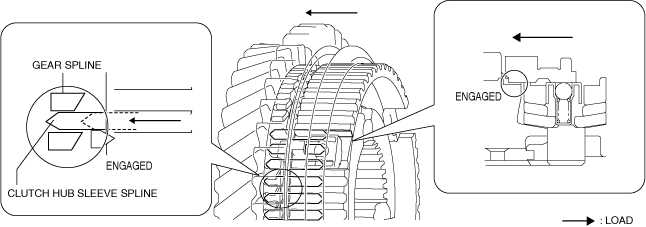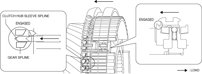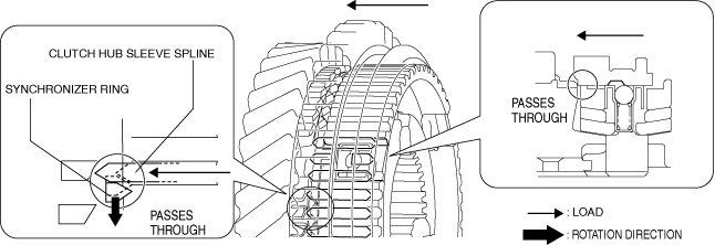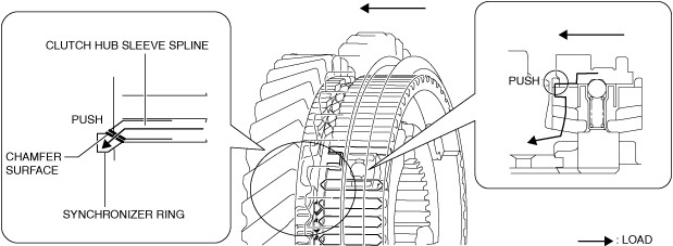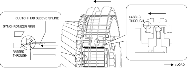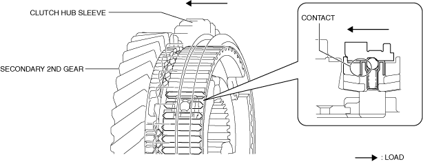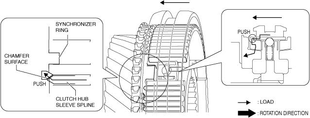 6.When the clutch hub sleeve moves toward the secondary 2nd gear side, the transmitted load to the gear from the clutch hub sleeve increases because the spline of the clutch hub sleeve pushes the chamfer of the synchronizer ring.