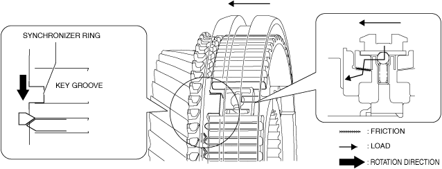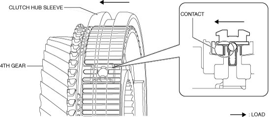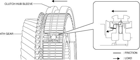 2.When the clutch hub sleeve moves toward the 4th gear side, the following synchronizer key applies load to the synchronizer ring, and the load is transmitted from the synchronizer ring to the gear.