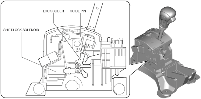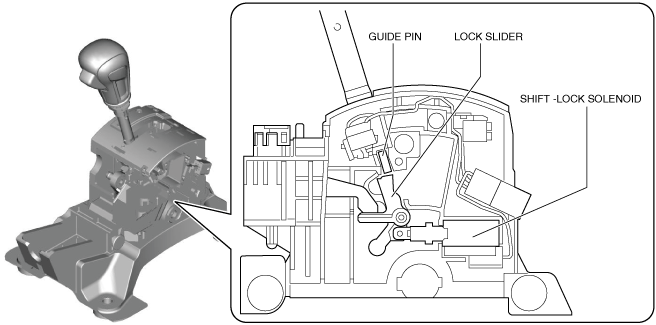 • When the shift-lock release conditions are not met, the shift-lock operates (The selector lever cannot be moved to any position other than P).• Because there is no energization to the shift-lock solenoid at this time, the shift-lock solenoid is not energized.• As a result, the lock slider is in the position shown in the figure and the movement of the guide pin in the downward direction is controlled by the lock slider.• For selector levers in which movement is controlled by the guide pin, the selector lever cannot be moved to a position other than the P position.