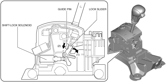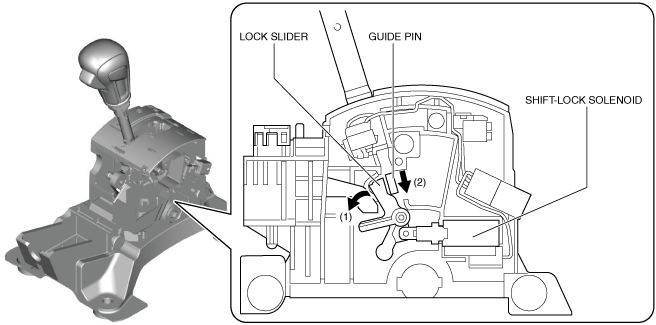• When the shift-lock release conditions are met, the shift-lock does not operate (The selector lever can be moved out of P).• At this time, the shift-lock solenoid is energized because there is energization to the shift-lock solenoid.• As a result, the lock slider moves in the direction shown by arrow (1) in the figure. Then, the guide pin can move in the direction of arrow (2) shown in the figure.• For selector levers in which movement is not controlled by the guide pin, the selector lever can be moved to any position.