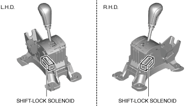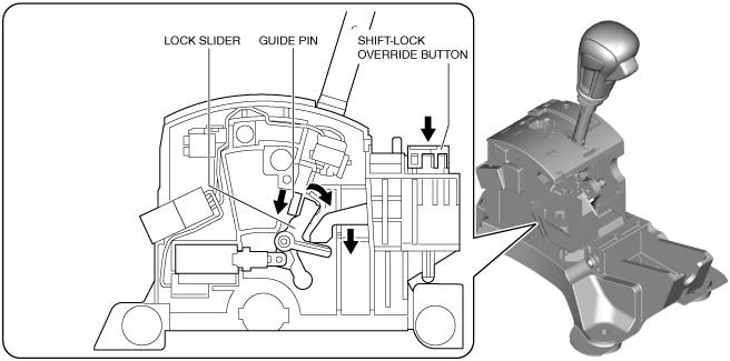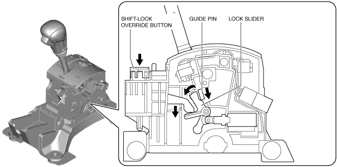 • The emergency manual shift-lock release system can be released manually even if the shift-lock release conditions are not met.• The guide pin restriction can be cancelled forcibly by pressing in the shift-lock override button using a flathead screwdriver, and moving the lock slider.• As a result, the selector lever can be moved to any position.