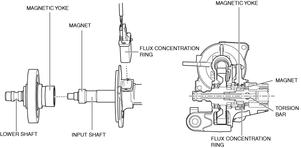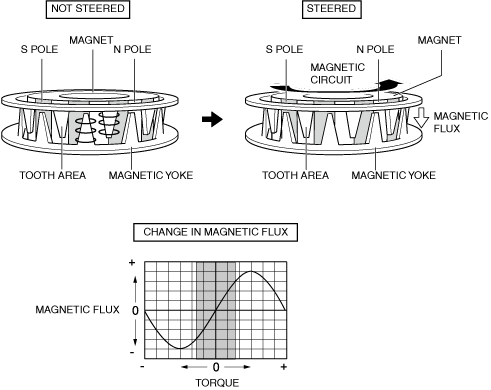 • Magnetic flux is transmitted to the Hall ICs when the steering wheel is operated because the positions of the magnet and the tooth area of the magnetic yoke change as the torsion bar connected to the input shaft and lower shaft twists.
