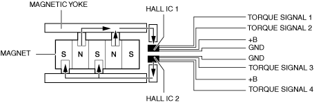 • Electrical signals from each of the two Hall ICs in the torque sensor are calculated in the EPS CM and used for each type of control as steering torque signals.