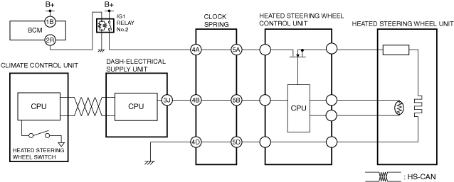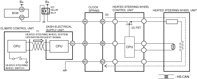 1.When the heated steering wheel switch is turned on with the ignition switched ON (engine off or on), the climate control unit sends (1) a heated steering wheel system operation request signal to the heated steering wheel control unit.