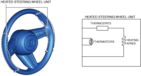 • The heated steering wheel control unit supplies voltage to the heating wires built into the heated steering wheel units.• The heated steering wheel control unit detects the temperature around the heated steering wheel units by the thermistors built into them.• The heated steering wheel control unit maintains a temperature of approx. 37 °C {99 °F} around the heated steering wheel units by intermittently suppling voltage to the heated steering wheel units according to the temperature detected by the thermistors.