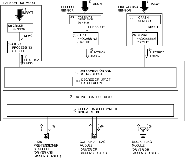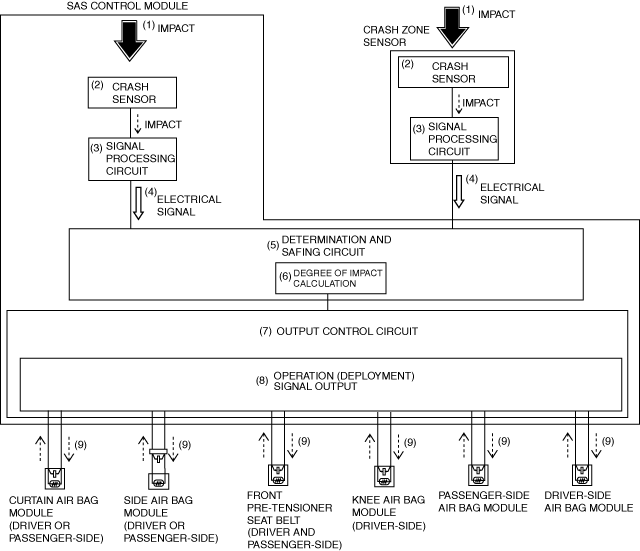 4.Each air bag module or pre-tensioner seat belt operates (deploys) (9) based on the operation (deployment) signal from the SAS control module.