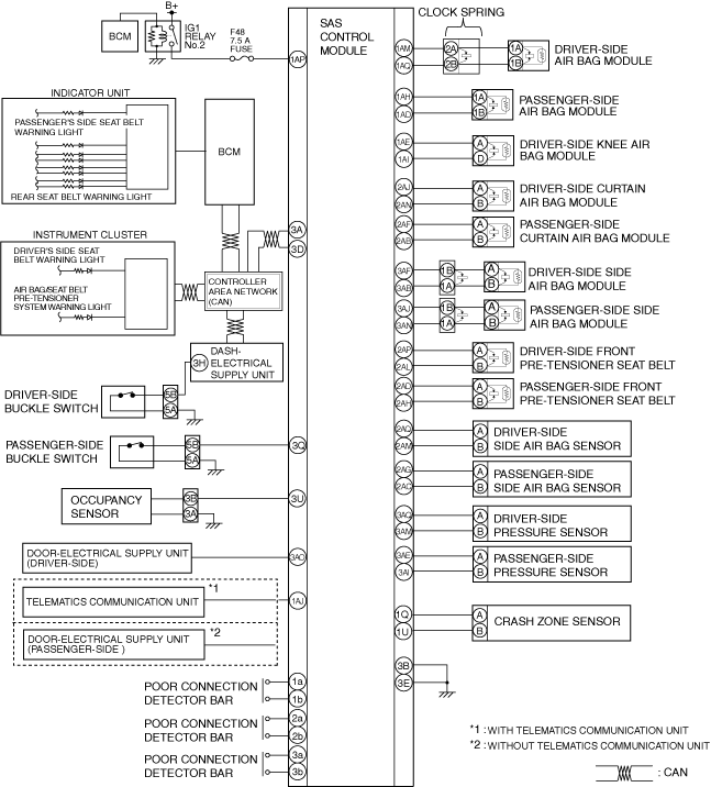 ― Crash sensor integrated into side air bag sensor― Crash sensor integrated into SAS control module― Pressure detection sensor integrated into pressure sensor