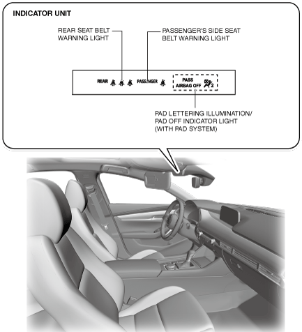 ― Passenger’s side seat belt warning light― Rear seat belt warning light― Passenger air bag deactivation (PAD) lettering illumination (with passenger air bag deactivation (PAD) system)― Passenger air bag deactivation (PAD) OFF indicator light (with passenger air bag deactivation (PAD) system)