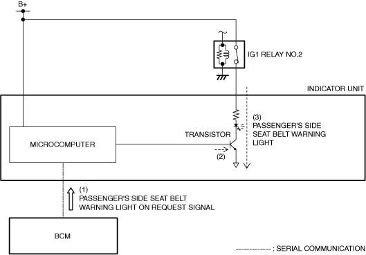 1.When the indicator unit receives (1) the passenger’s seat belt warning light on request signal from the BCM while the ignition is switched ON (engine off or on), it turns on (2) the transistor.