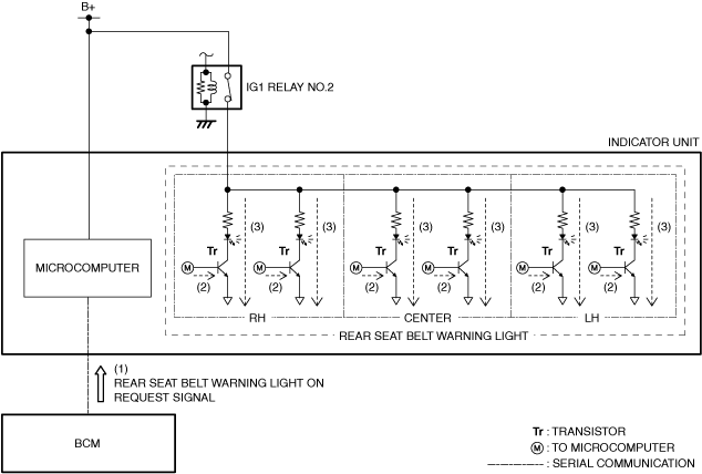 1.When the BCM receives (1) the rear seat belt warning light on request signal from the instrument cluster while the ignition is switched ON (engine off or on), it turns on (2) the transistor.