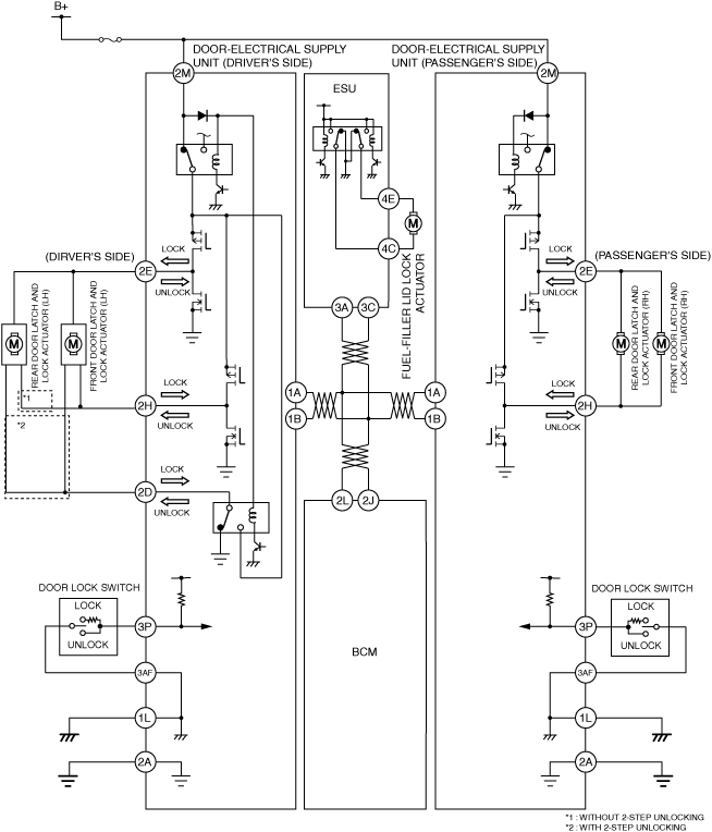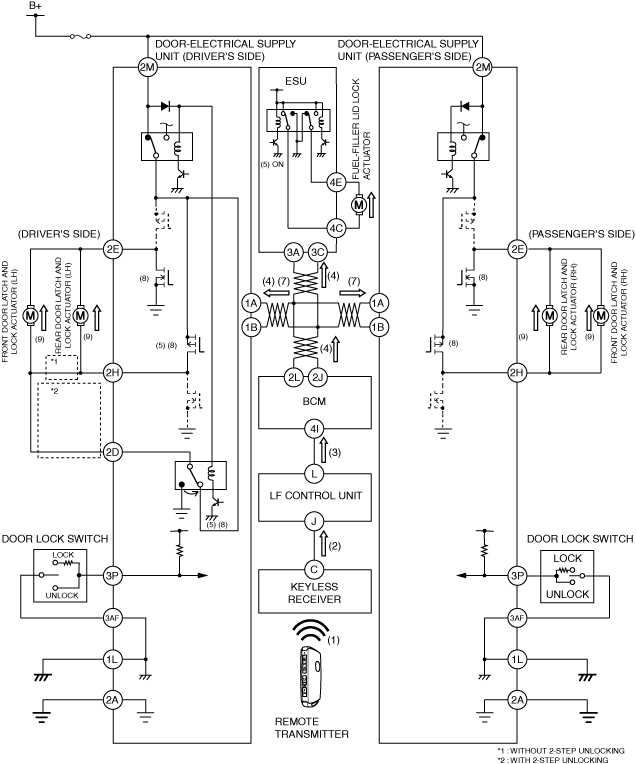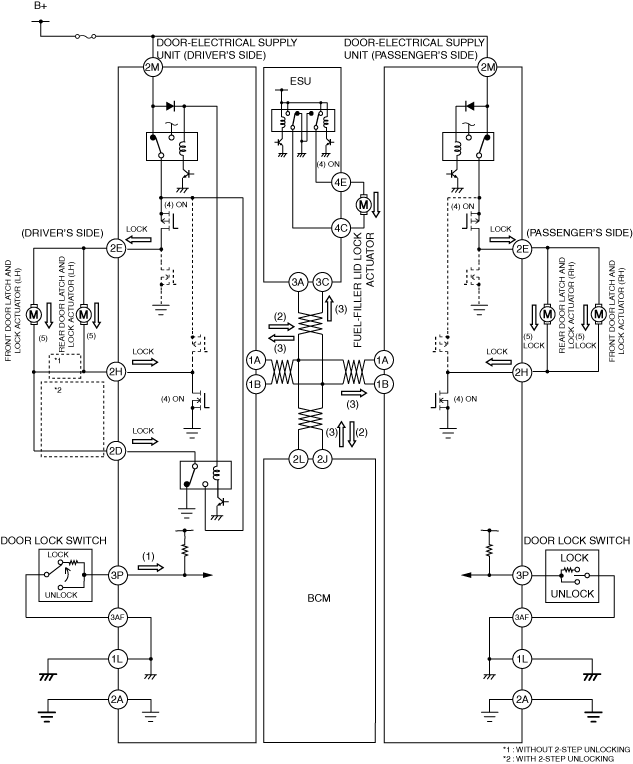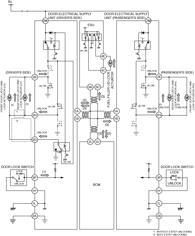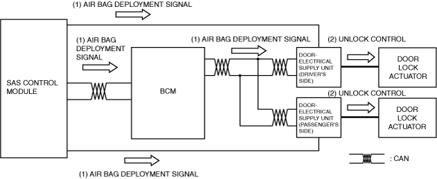 1.When the door-electrical supply unit (driver’s side) detects a door lock switch unlock signal (1), it sends a door lock switch unlock signal (2) using CAN communication to the body control module (BCM).