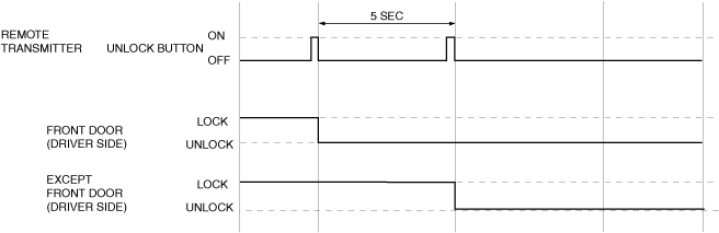 Timing chart of 2-step unlocking function operation using keyless entry remote transmitter