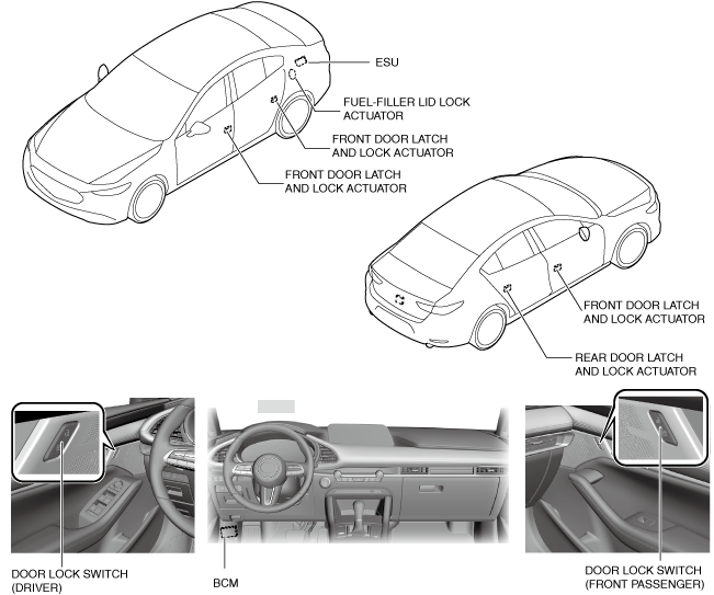 1.When the door-electrical supply unit (driver’s side) detects a door lock switch lock signal (1), it sends a door lock switch lock signal (2) using CAN communication to the body control module (BCM).