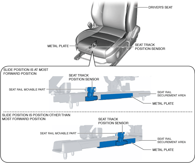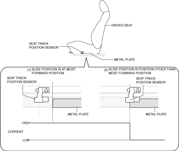 2.When the slide position of the driver’s seat is any position other than the most forward position, the seat track position sensor detects the metal plate and the current output by the seat track position sensor decreases.