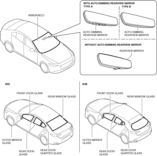 • Auto-dimming outer mirrors have been adopted which prevent the driver from being blinded by light from vehicles at the rear in conjunction with the auto-dimming rearview mirror. (With auto-dimming outer mirror)