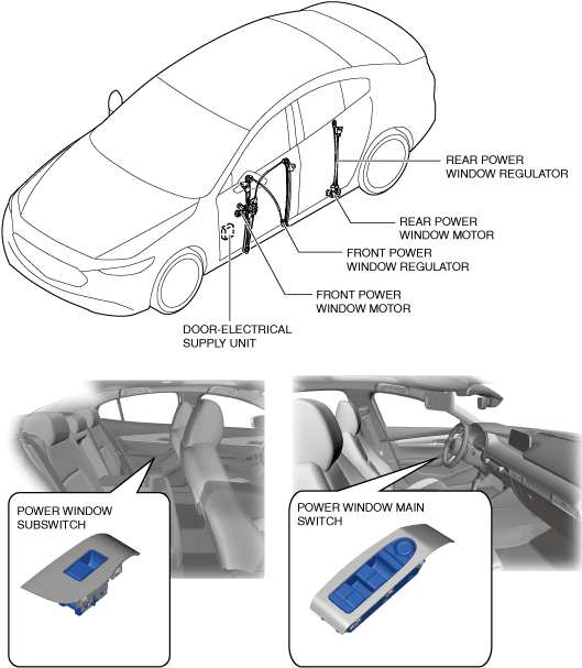 • A power window system has been adopted with which the door glass can be opened/closed electrically by operating the power window main switch or the power window subswitches.