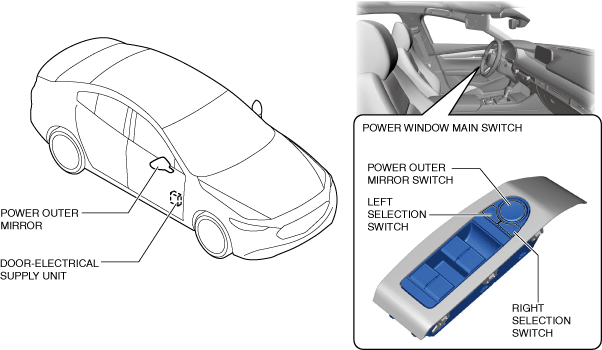 • A power outer mirror system has been adopted with which the outer mirrors can be operated remotely using the power outer mirror switch.