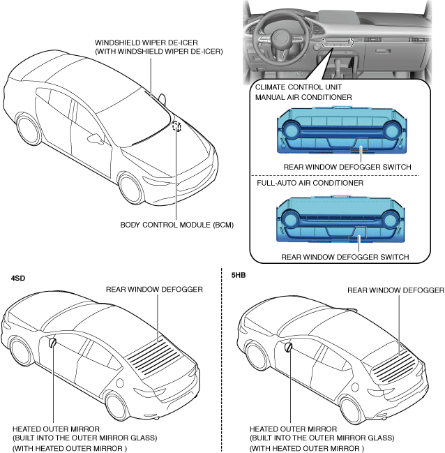 Rear window defogger/heated outer mirror/windshield wiper de-icer